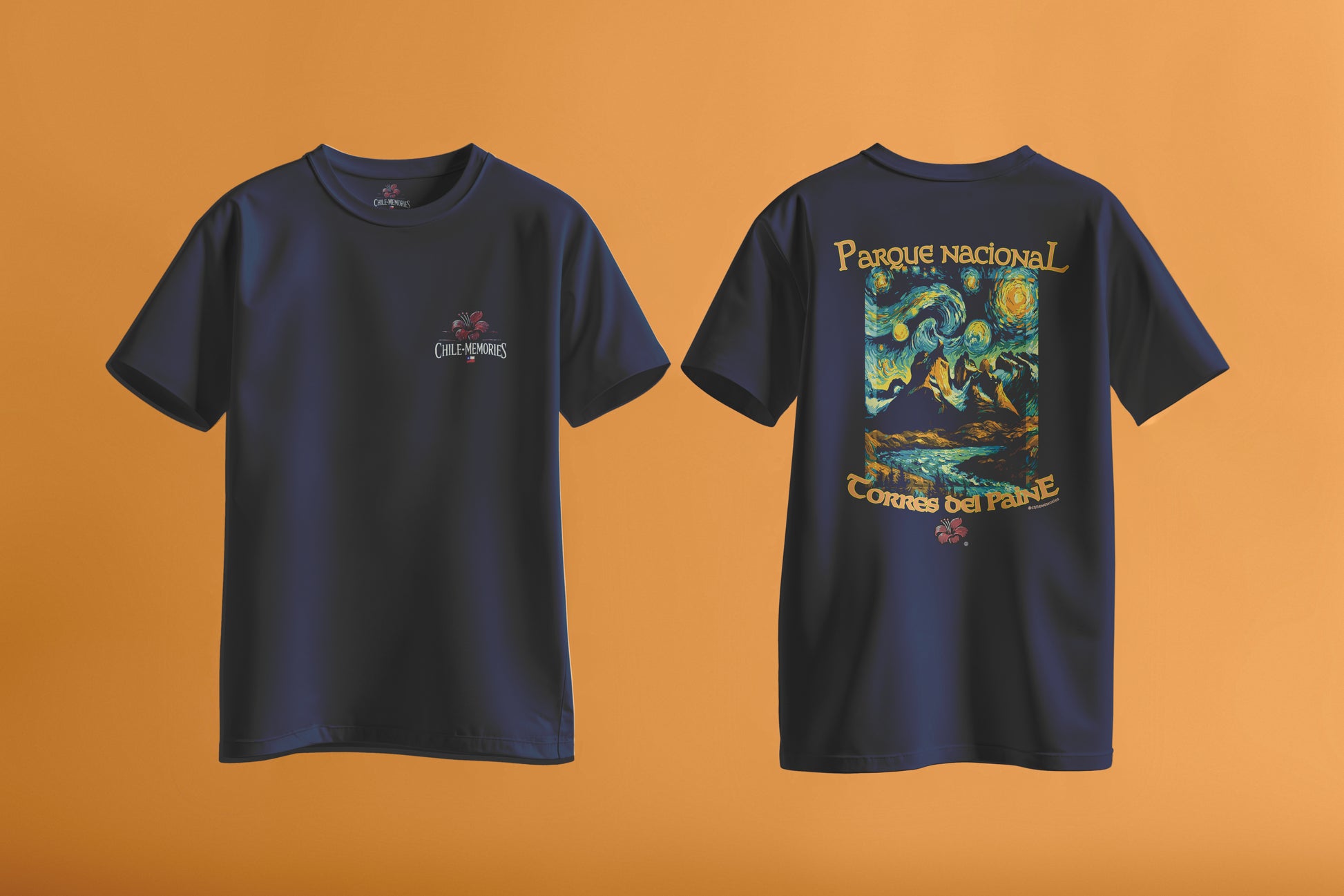 La parte frontal presenta un elegante logo minimalista de Chile Memories que aporta distinción y sencillez, mientras que en la espalda luce un espectacular diseño artístico inspirado en la belleza sobrecogedora de las Torres del Paine con un estilo vibrante inspirado en Van Gogh.
